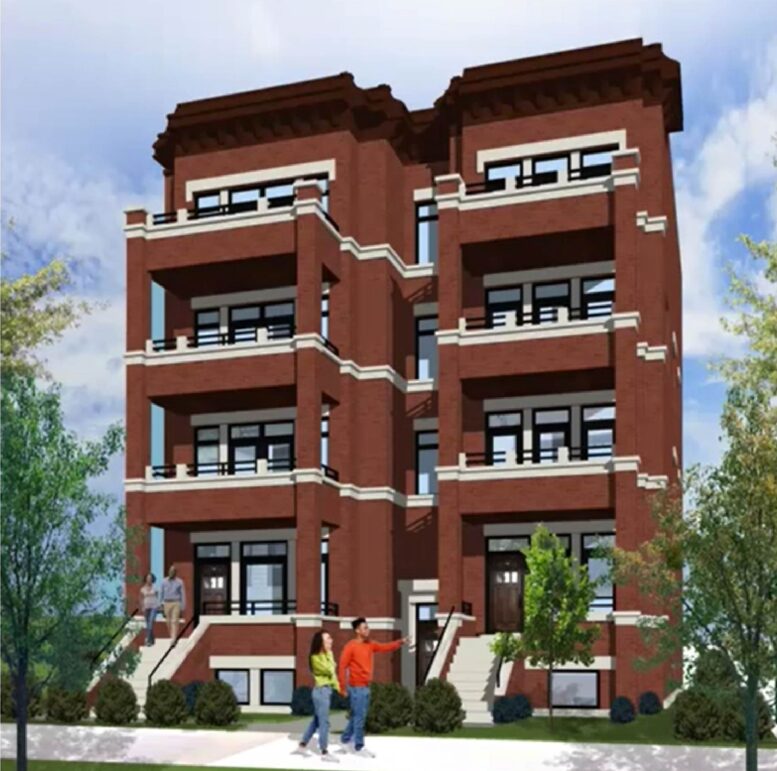 The 47,000+ square-foot lot will be redeveloped with four separate four-story buildings, designed by Hanna Architects. Each structure will rise approximately 52 feet in height and be clad in red brick with cast-stone accents. The overall design draws inspiration from Chicago’s traditional six-flat buildings, and will contain a total of 90 units across the four structures.