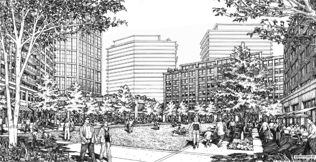 The overall development will add new office space and approximately 2,800 residential units, including those in the first phase. It will emphasize the pedestrian experience and strengthen the connection between two city neighborhoods. The project is expected to cost over $1 billion and take several years to complete, depending on market conditions and demand.