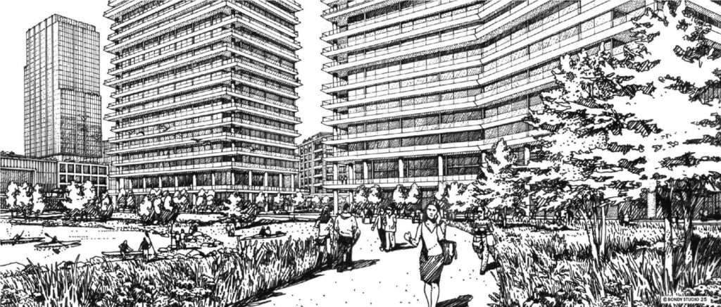 There’s a huge amount of “public space” around the margins of these buildings. Too much. It’s there to make the professional city planners (who would never allow our most desirable neighborhoods to be built today) and neighborhood guardians oooh and ahhh. But it’s totally anti-urban. The whole thing is going to have a master-planned suburban office park feel about it. And residents are going to spend a lot of time walking past set-back towers and large, interconnected unoccupied landscaped areas that definitely won’t feel safe after sunset.