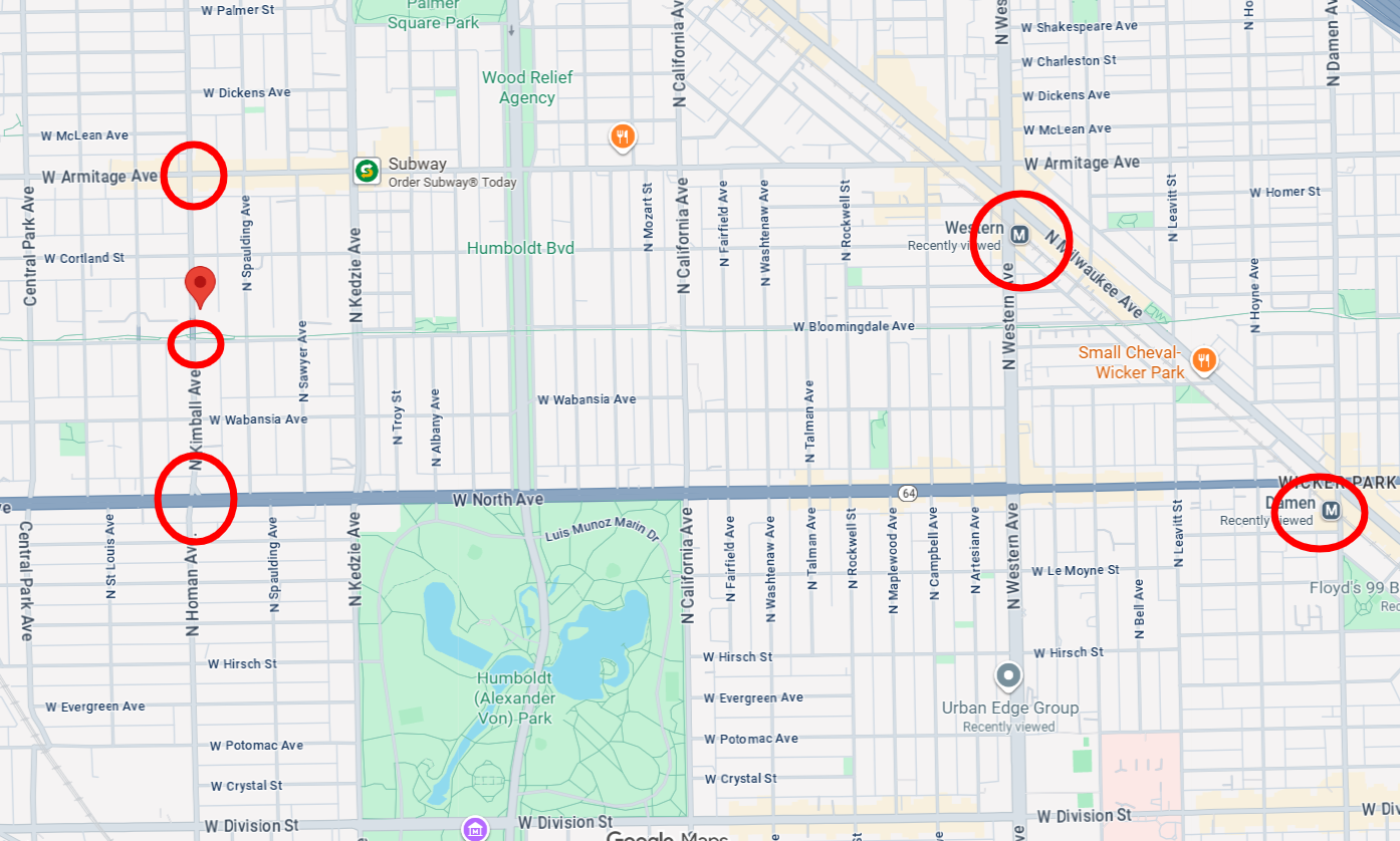 1821 North Kimball is one block from access to the Bloomington (606) Trail. For transit, the Route 82 Kimball-Homan bus stops on Kimball Avenue at the 606. East-west buses are available two blocks north at Armitage Avenue (Route 73) and two blocks south at North Avenue (Route 72.) The 72 bus is the easiest way to get to an elevated train, with the Damen Blue Line platform located two miles east at North and Damen Avenues.