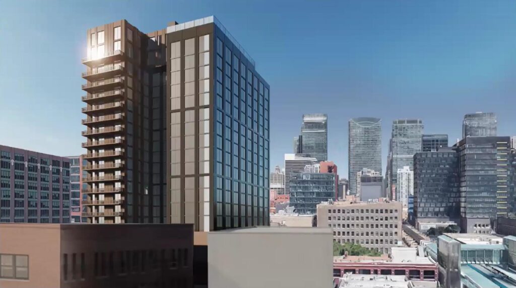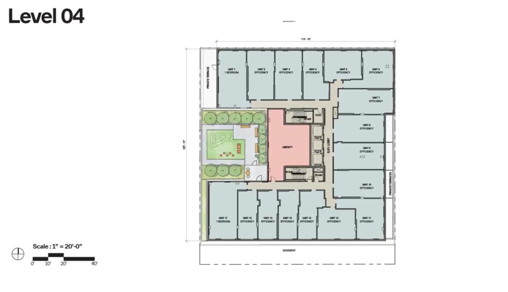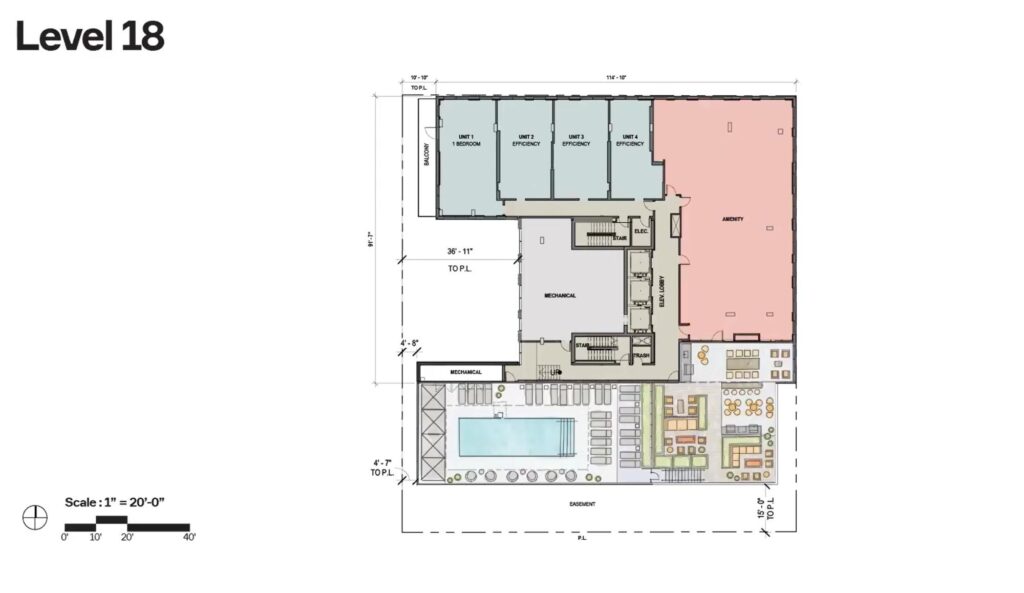 The remainder of the tower will contain 268 residential units, consisting of studios and one-bedroom layouts. Select one-bedroom units will include outdoor terraces. Of the total unit count, 54 will be designated as affordable. All residents will have access to a rooftop amenity space and terrace with a larger pool.