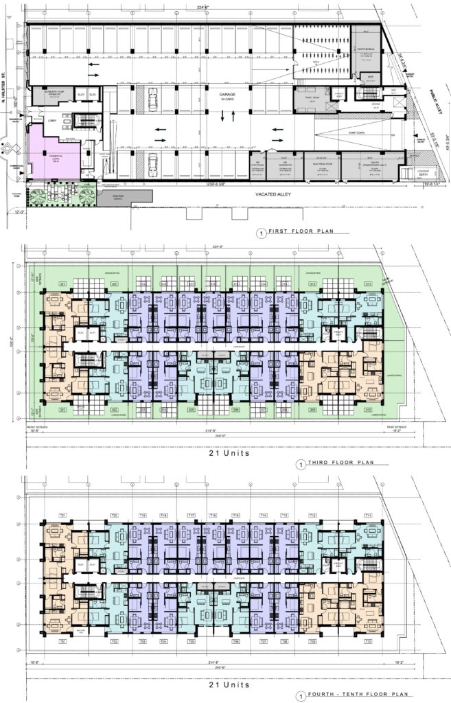 The ground floor will feature a 900-square-foot café on the southwest corner. This space will have access to a landscaped seating area, which will partially replace the existing alleyway along the southern edge of the site. Vacating this alley will allow for the removal of the Halsted curb cut, the creation of a dog run, and the simplification of service access.