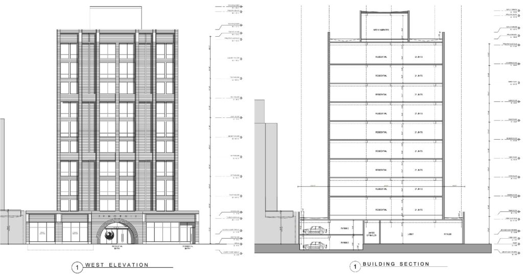 Joining the café will be a small lobby, a bike parking room, and a 77-vehicle parking garage. The garage will span two levels: one partially underground and one partially raised first floor, accessed from separate entries along the alley. Above this will sit the residential tower, capped by a rooftop amenity space, outdoor deck, and fitness room.