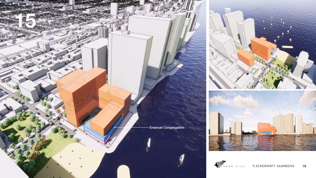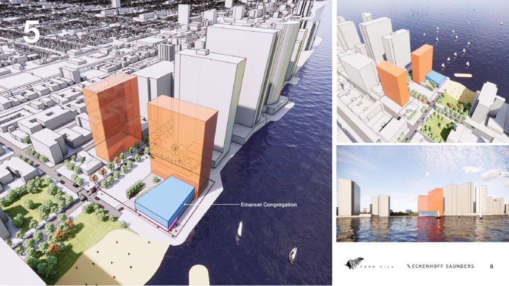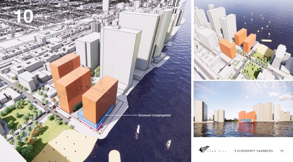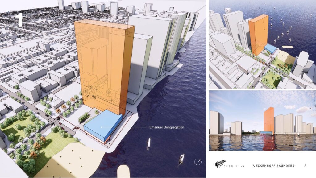 Then the new 16,000-square-foot synagogue would be located on the east end of the site, leaving space for a small lakefront path. It would also include its own parking garage on the ground floor. This placement remained consistent across all massing iterations, of which the team presented 16 in total. These concepts varied between one, two, and three towers, including the option of building on the Fern Hill lot.