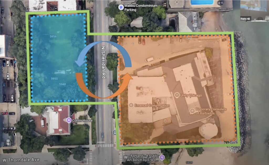 This brings us to this week, when the development team presented their initial massing concepts to the congregation. The presentation was done in collaboration with local architecture firm Eckenhoff Saunders. The first phase of the project would shift the site’s main access from Sheridan Road to a small strip of Thorndale Avenue to the south, which offers the benefit of a stoplight.