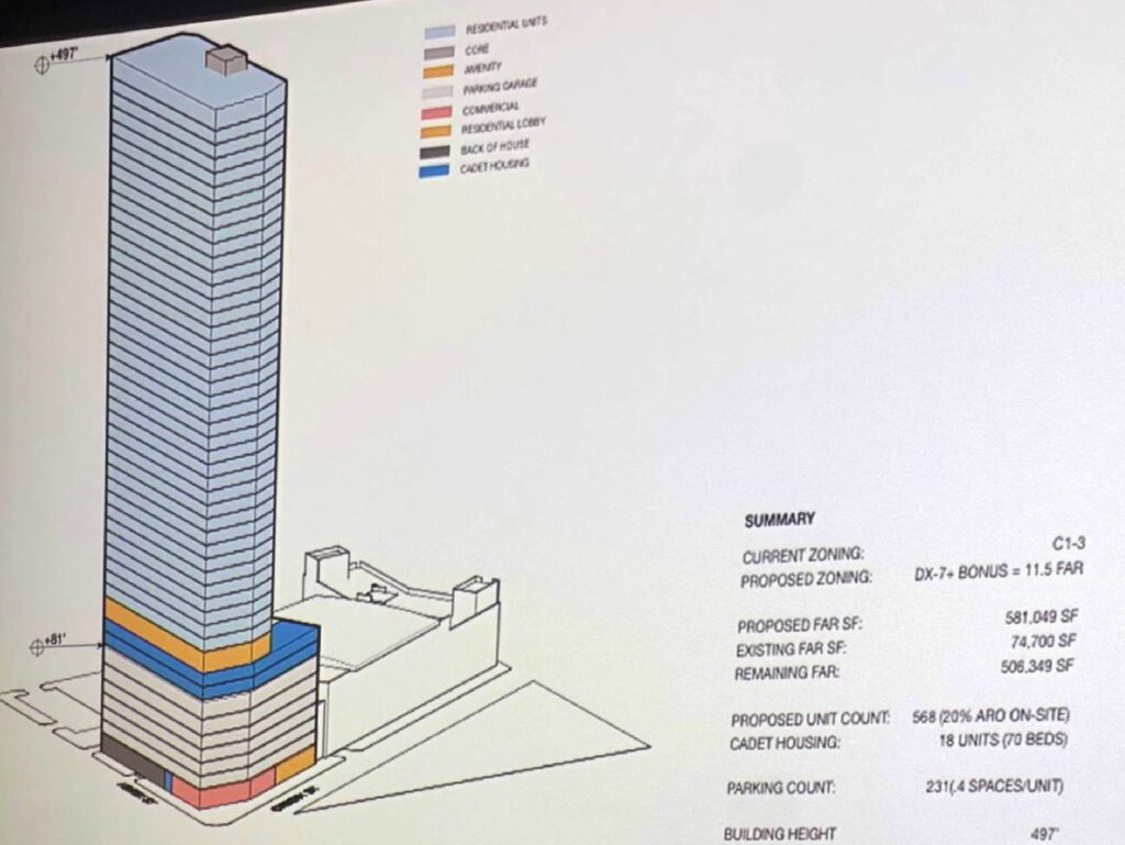 Said plans call for a 40-story and 497-foot tall skyscraper that will occupy the entirety of the site. This would be anchored by ground floor retail space along with a 231 space garage within the podium, this would be shared with the church itself. The tower contains 568 residential units of which 20-percent will be on-site affordable.