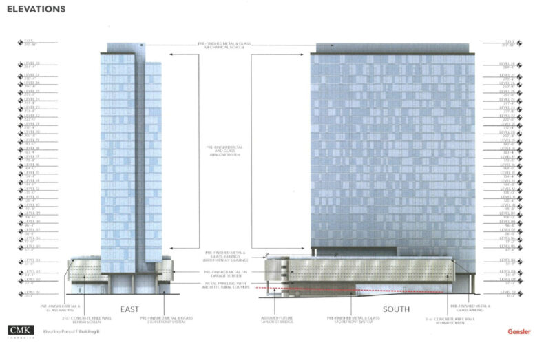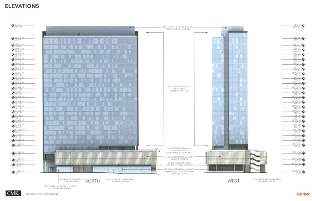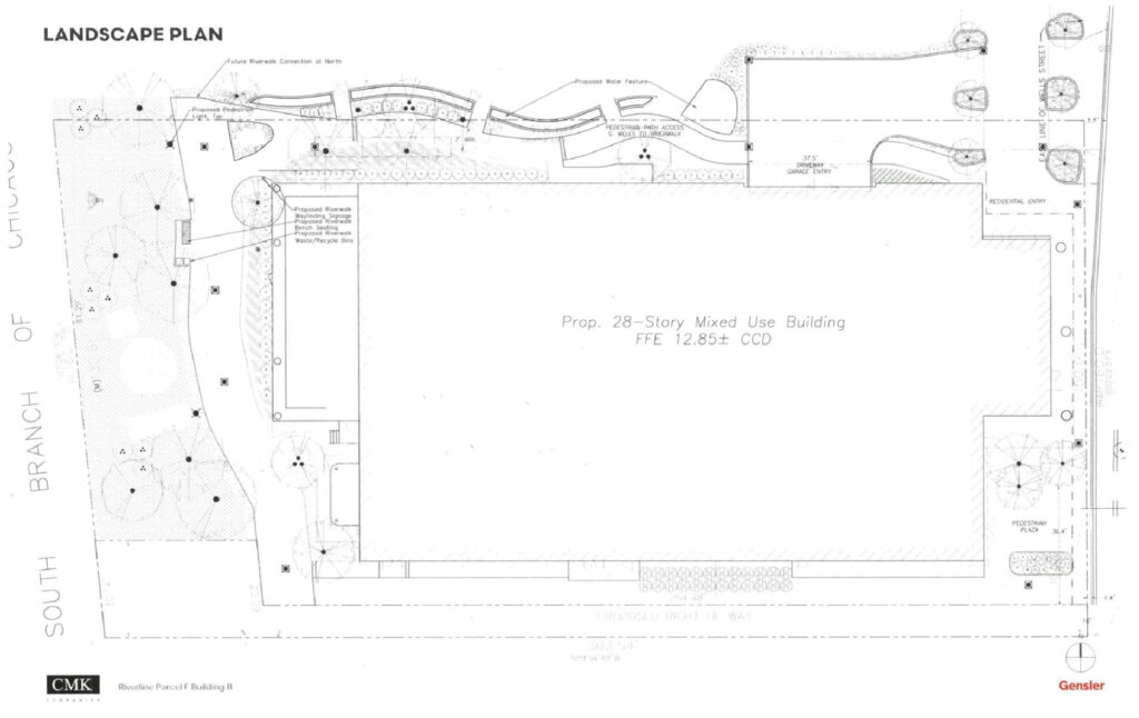 Extending west from the driveway will be a landscaped pedestrian walkway with a water feature that connects to an extension of the riverwalk. The building itself will occupy the southeast corner of the site and will rise 28 stories, topping out at 310 feet in height. This includes a large three-story podium that will primarily contain 137 parking spaces.
