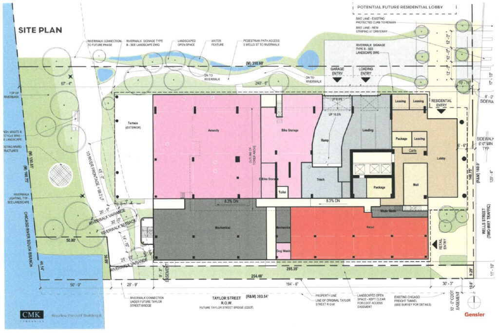 The tower will rise near the northern edge of Riverline, replacing half of an existing parking lot bounded by an extension of Taylor Street to the south. This extension is also earmarked for a future bridge over the Chicago River, according to the plans. Additionally, south of Taylor Street will be the first phase of Riverline at 1010 South Wells Street, which began light foundation work earlier this year.