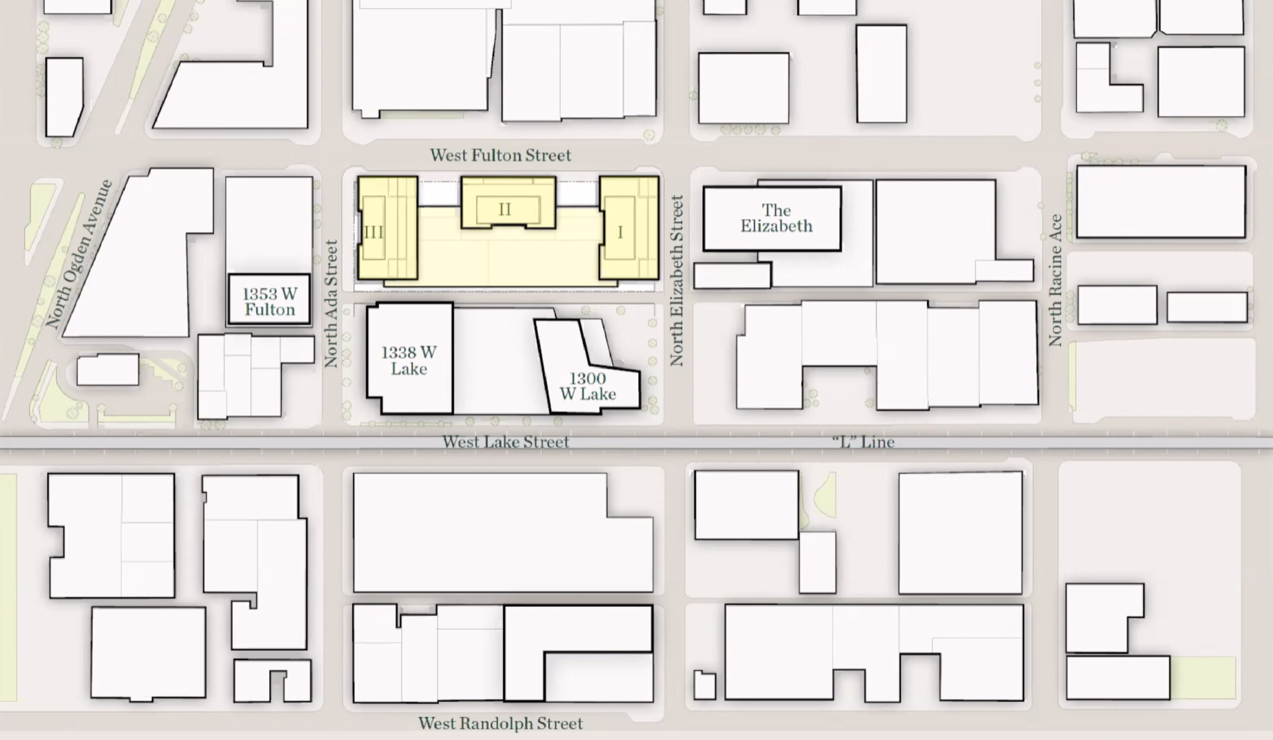 Site plan of 1325 West Fulton Street by KPF and ParkFowler Plus, with 1300 and 1338 on the south side of the block.