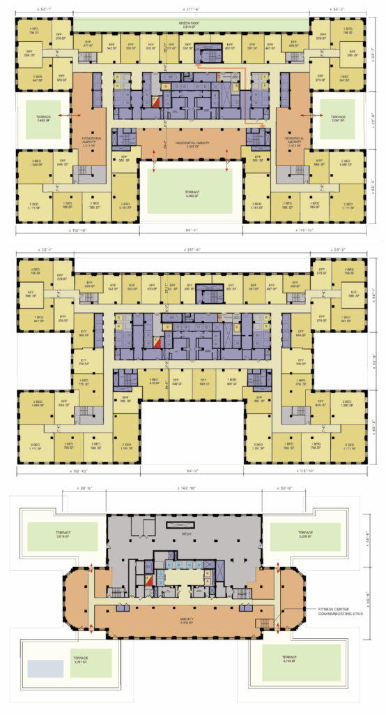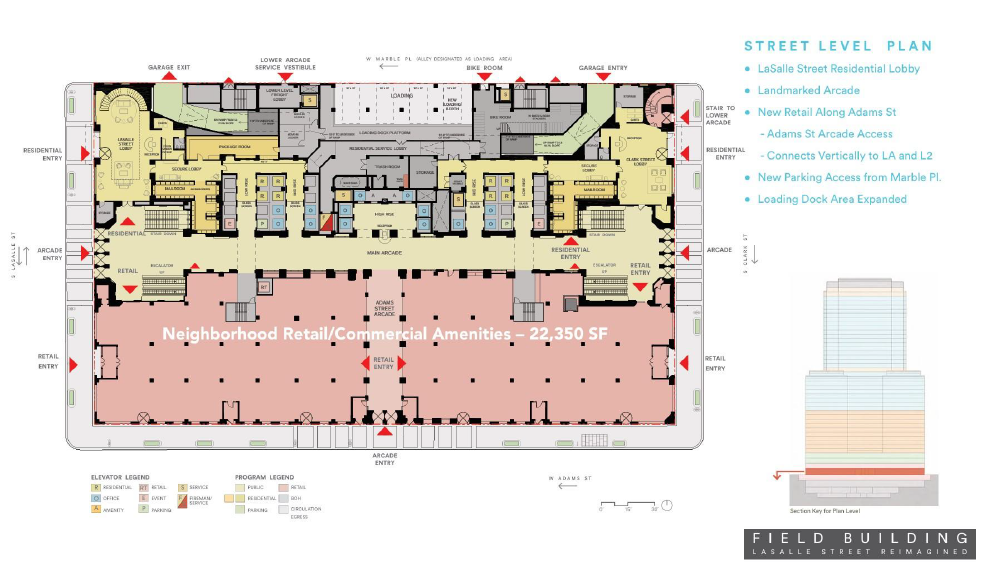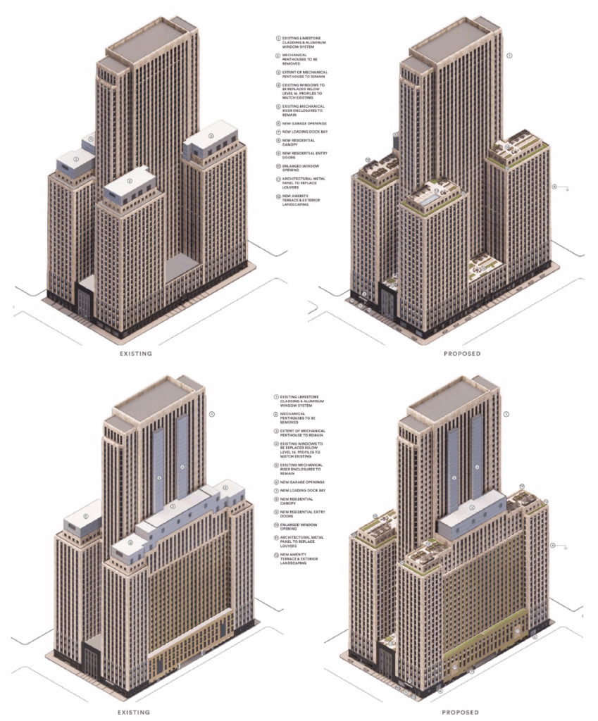 Rising 44 stories in height, the redesigned ground level will preserve the famed central arcade cutting through the block-long structure. Adjacent to this will be 92,000 square feet of commercial space along Adams Street across three floors. The development team hopes to attract a much-needed grocer to the neighborhood, along with medical offices and a fitness center.