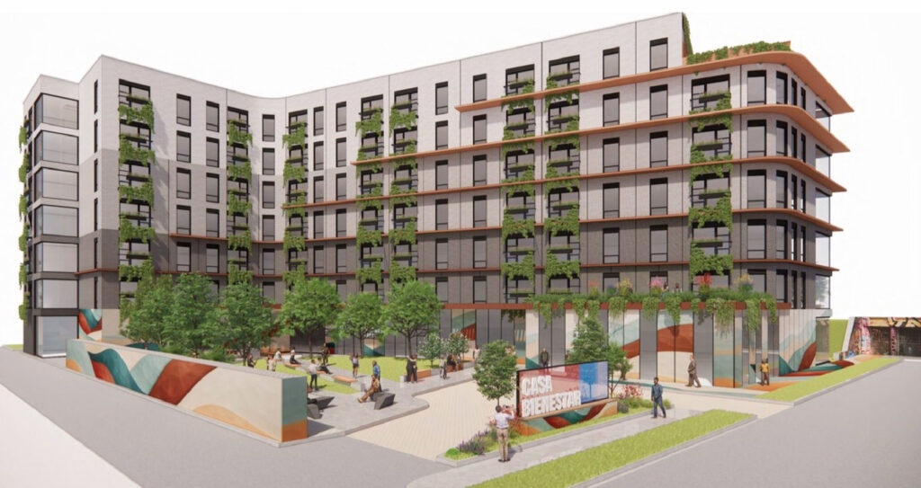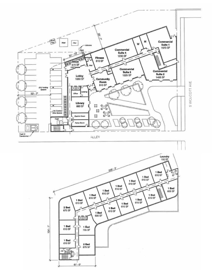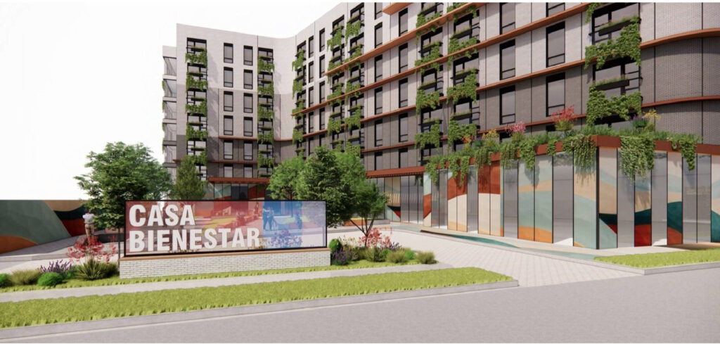 Dubbed Casa Bienestar, the L-shaped building will rise along the northern end of the site, creating a large central courtyard on the ground floor. This will be joined by a small drop-off loop off Wolcott and a 21-vehicle parking lot at the rear off the alley. The first floor will also feature a small lobby, community room, fitness room, and library space for residents.