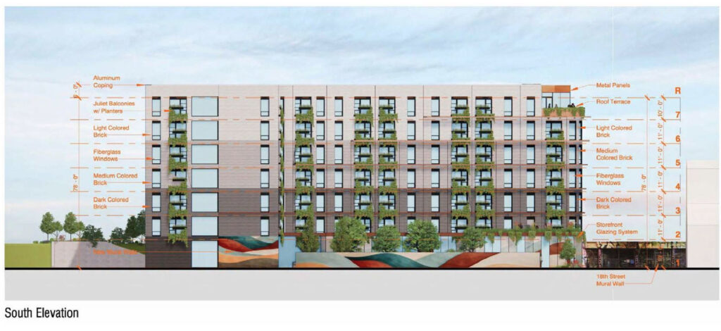 Additionally, the building will include 5,480 square feet of commercial space split into four office suites aimed at attracting social service providers. The rest of the structure will contain 106 residential units, consisting of 94 one-bedroom and 12 two-bedroom layouts. Residents will also have access to another community space and a terrace on the top floor.