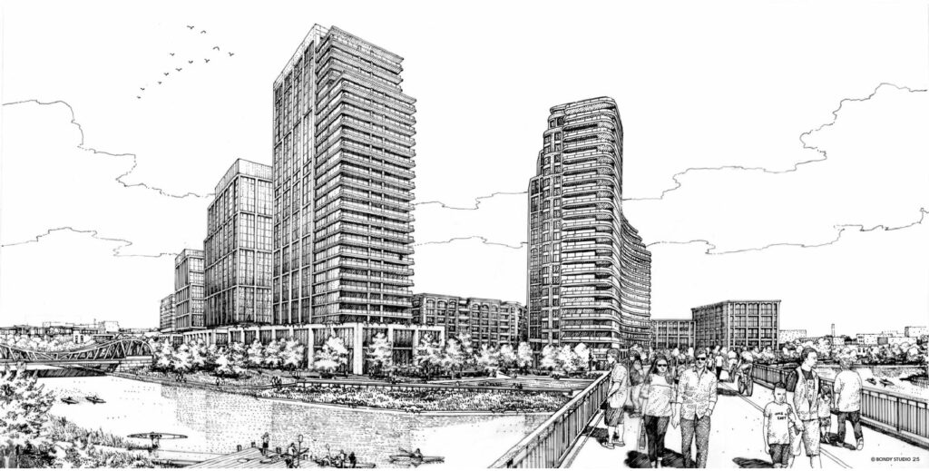 Set to replace the majority of the land north of the river, Foundry Park was first revealed earlier this year as JDL finalized the purchase of the 45-acre site. The development will be built in phases and is being designed by local firm HPA. It will contain 3,737 residential units, consisting of 2,902 apartments and 305 for-sale condominiums, townhomes, and single-family homes. Of those, 20-percent will need to be affordable.