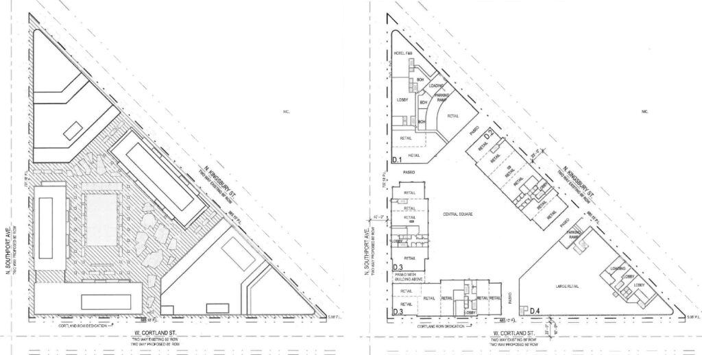 On the taller end, buildings will range from 50 to 520 feet in height across all phases, with the first phase containing the tallest tower. This initial phase was further detailed in the zoning application and will sit within a wedge formed by North Kingsbury Street, West Cortland Street, and North Southport Avenue. It will contain a total of 900 residential units.