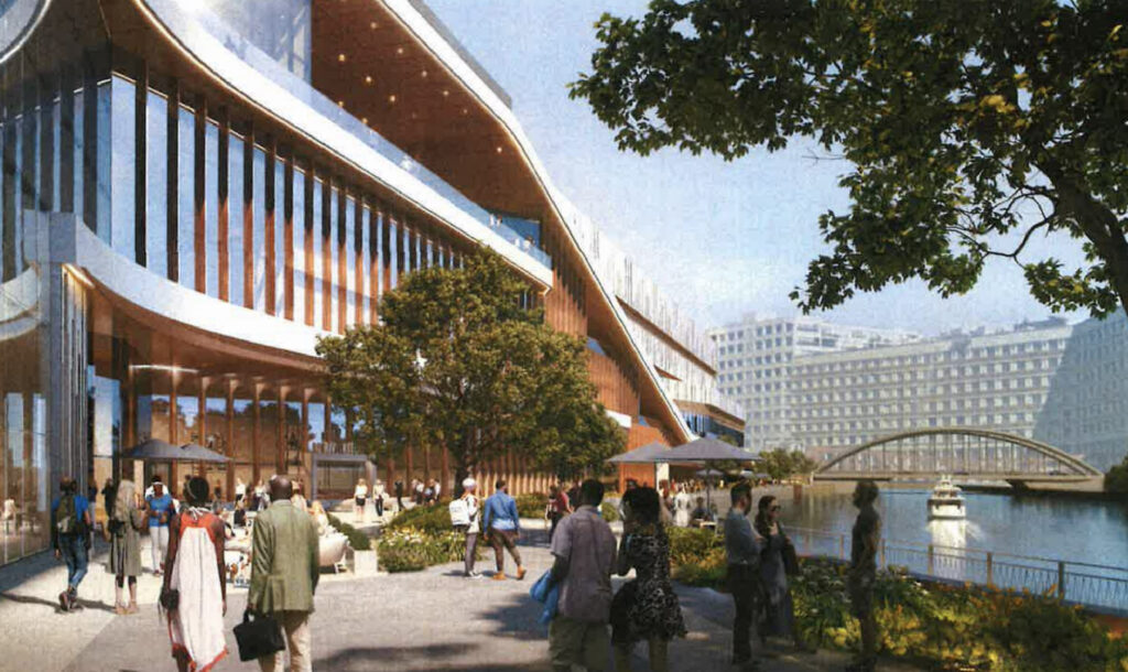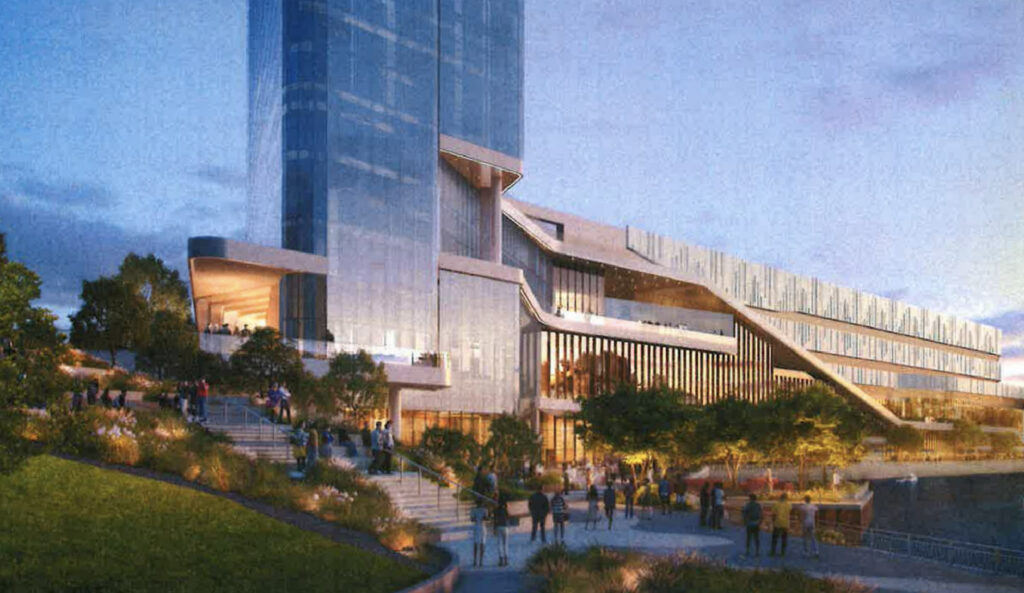 The lower level along the water will feature a large plaza on the northern corner, as well as a water taxi stop. To help activate the riverwalk, there will be four food and beverage options, along with entrances to both the casino and the event center. The southern end will be anchored by a large restaurant within the base of the hotel, connecting to a new public park.