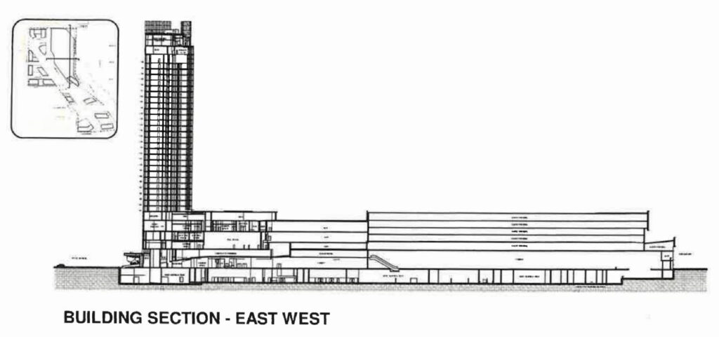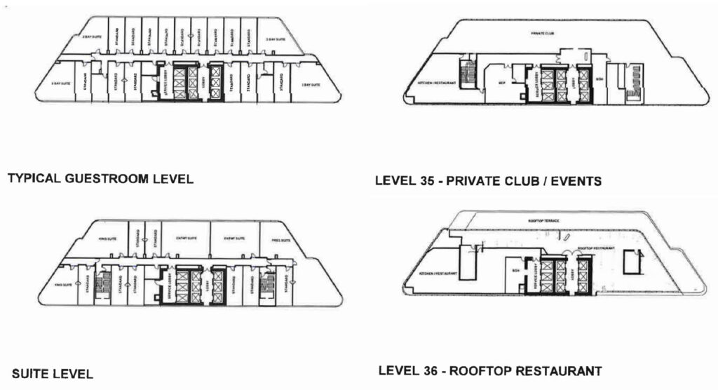 Above the casino floor will be a mezzanine housing a poker room, additional meeting space, and three floors of exhibition space within the hotel tower for a small museum. Along with parking, the sixth floor will contain the hotel’s spa and fitness center. The hotel itself will rise 36 stories and include 500 rooms, including large suites on the top floors.