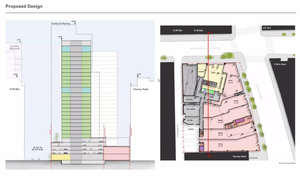 The current proposal takes a page from many River North projects, featuring a simple podium with a boxy tower above, capping out at 28 stories and 312 feet in height. The podium will rise four stories and include 24,000 square feet of visible retail space along State Street, along with a small lobby and a ramp leading to the parking garage on Elm Street.