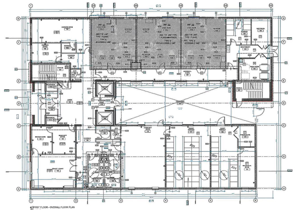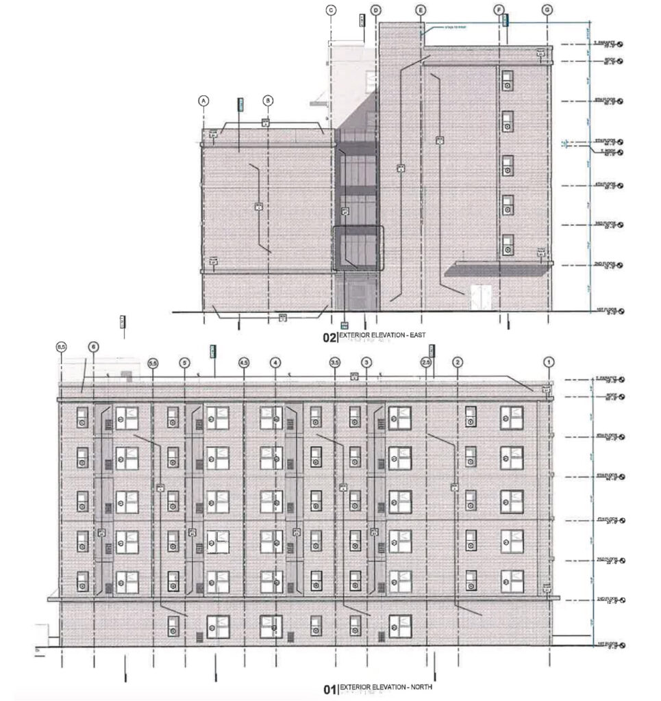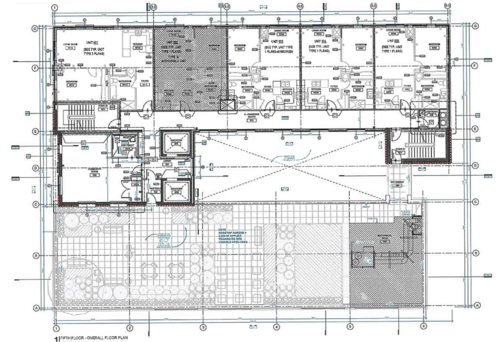 The ground floor will feature a large lobby along University Avenue, along with an exercise room, offices, a tenant lounge, tenant storage, a community room, and several residential units, all arranged around the building’s central landscaped courtyard. Four accessible parking spaces will be located at the rear of the site off the alley, accompanied by additional landscaped areas.