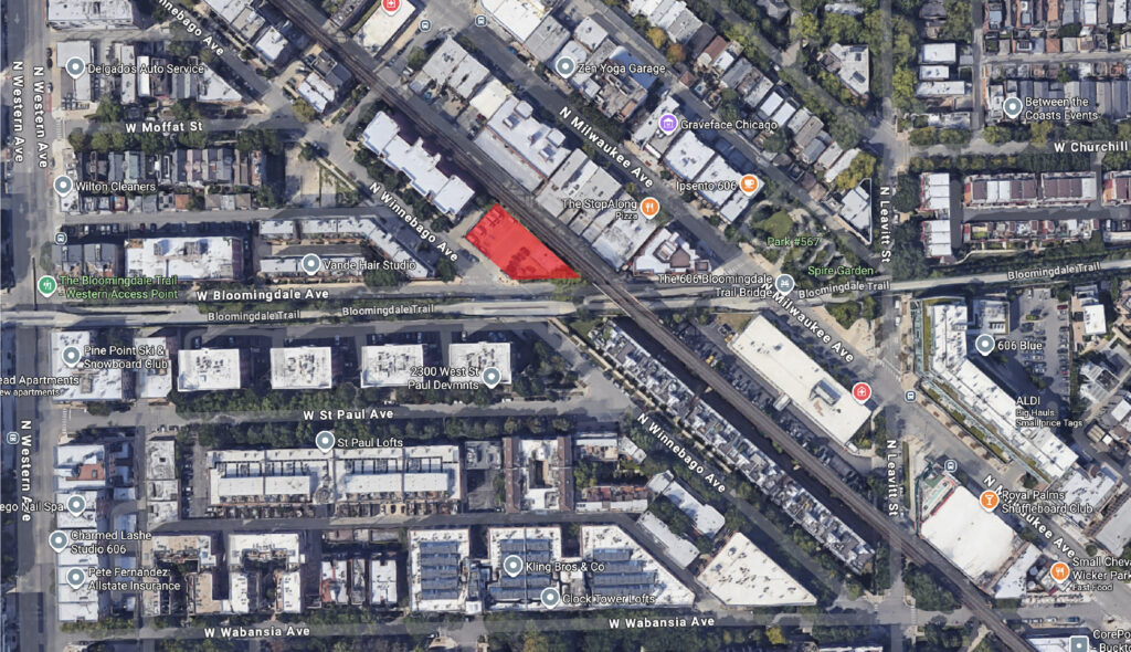 Plans have been revealed for a residential development at 1801 North Winnebago Avenue in Bucktown. The uniquely shaped site is bounded by CTA Blue Line tracks to the rear and the 606 Trail across the street to the south. Currently used as a parking lot, the property is slated for redevelopment by a local developer operating under the name 1801 N. Winnebago LLC.