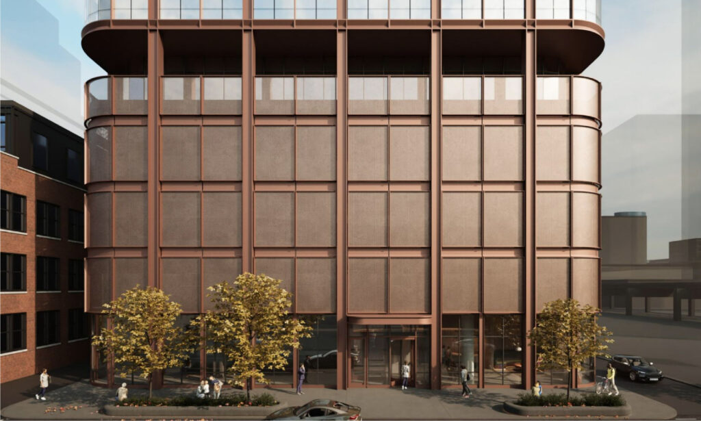 The remainder of the building would house 347 residential units, made up of studios, one-bedroom, and two-bedroom layouts. Of the total, 70 units would be considered affordable. All residents would have access to a rooftop amenity deck featuring a west-facing pool. The tower itself would be clad in glass with a copper- or bronze-colored metal grid detail.