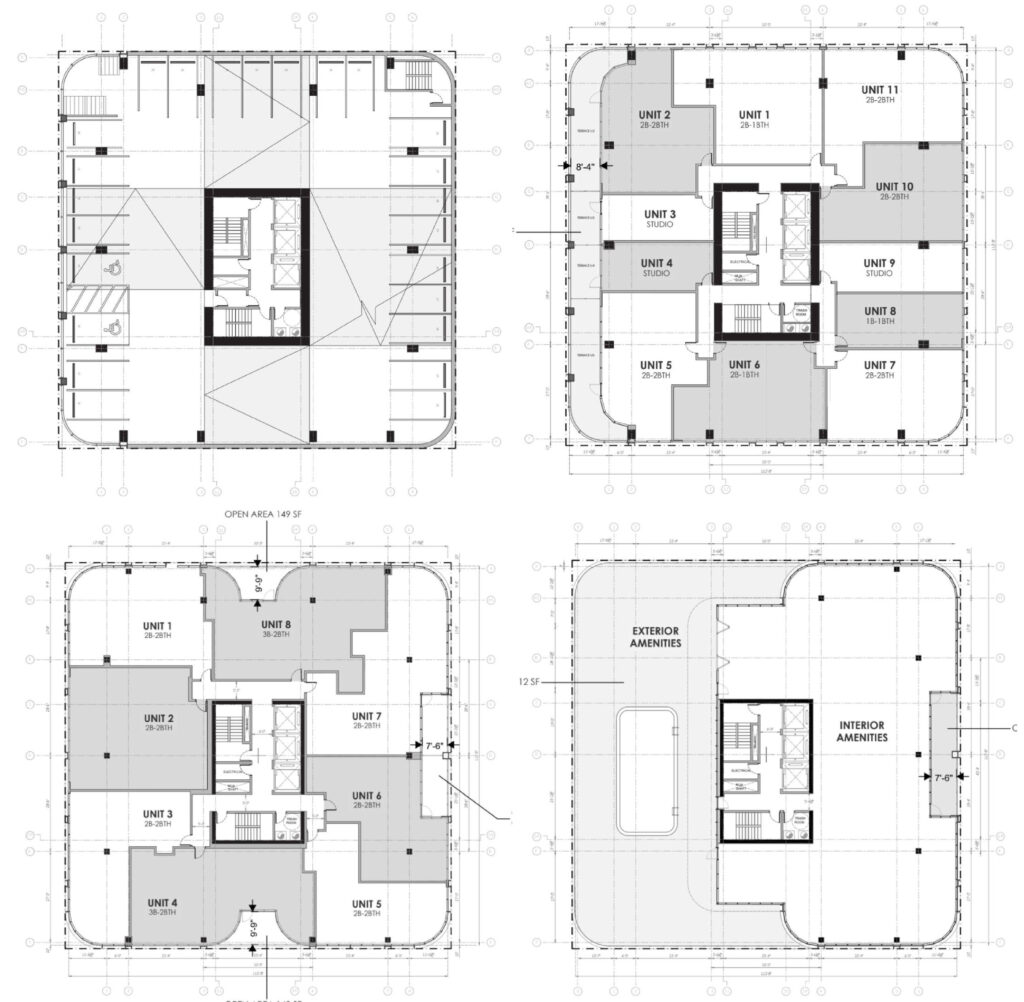 A few blocks over, the square-shaped tower would rise 30 stories and approximately 362 feet in height, with rounded corners. The ground floor would contain 1,128 square feet of retail space, a small lobby, and a ramp leading to an 88-space parking garage on the lower levels. The garage would be clad in a perforated metal screen and capped by a small terrace for the units within.