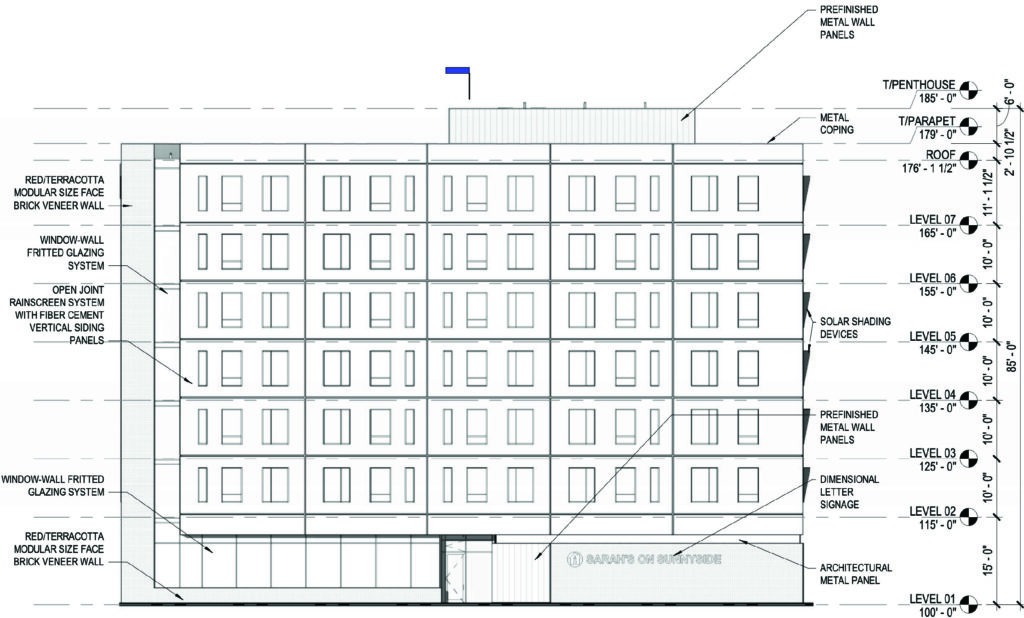 The building will be clad in a mix of red brick and precast concrete panels. A second phase is lightly detailed on the plans, showing an 11-story building rising in the middle of the site, parallel to Clarendon. This phase will contain additional units. The third and final portion to the south will eventually hold a third building; however, no details are currently known.