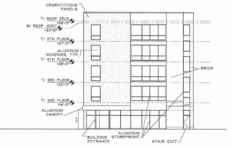 Clad in a mix of precast concrete and metal panels, the building will not include retail space or on-site parking. The project has been in the works for several years and has undergone multiple design iterations prior to the current scheme shown in the developer’s zoning application. The team will need to obtain city approval before breaking ground; however, a timeline has not yet been revealed.