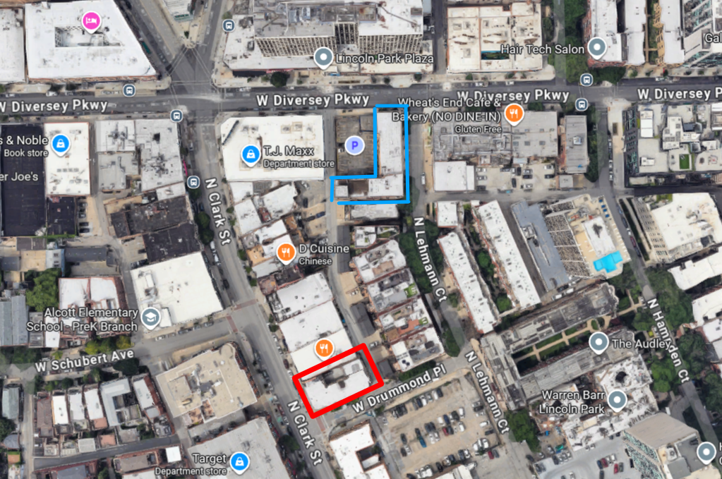 601 West Diversey (NE corner) in blue, 2701 north Clark (SW corner) in red. Via Google Maps