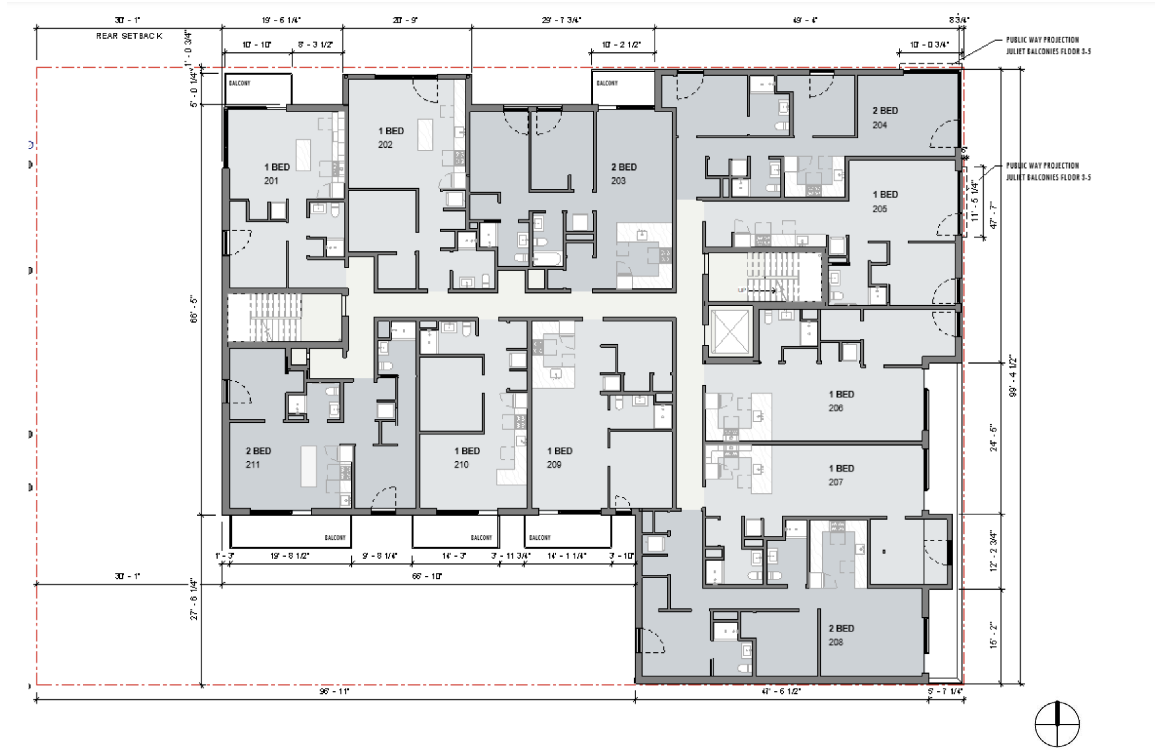 On the ground floor, the building’s main entrance will be located on Sheridan Road, connecting to the mail room, a common area, and bicycle storage. Half a dozen one-bedroom dwelling units will line Balmoral Avenue. A surface parking lot accessed from the alley off Balmoral will hold 25 spaces, with a little more than half of them partly sheltered by the south façade. The four upper floors will contain 11 units apiece, with each level holding four two-bedroom floor plans and seven one-bedrooms. Select units will have private balconies, while a rendering from 2rz Architecture shows a small shared deck on the roof.