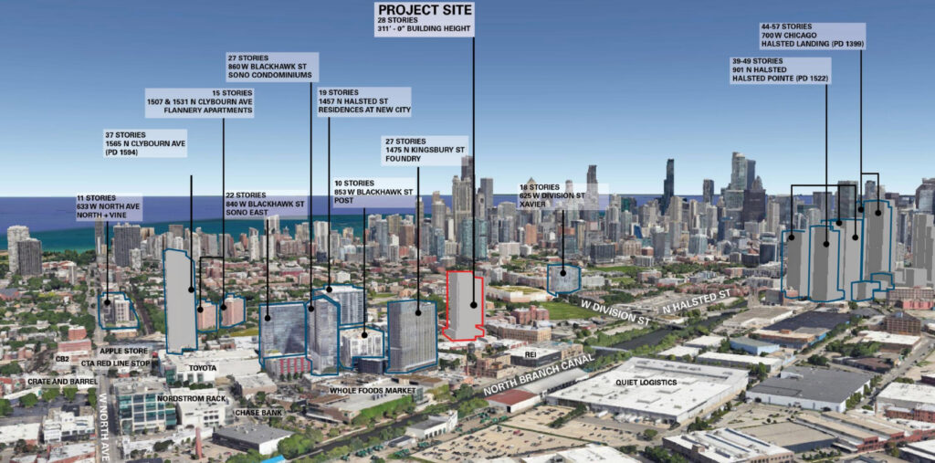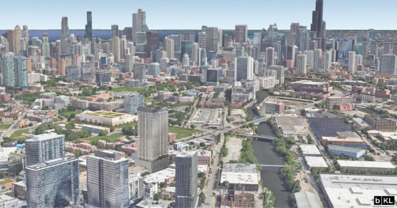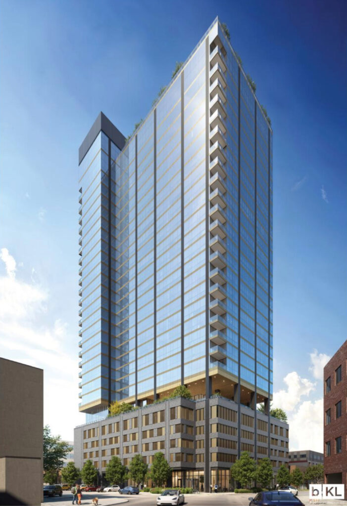 Local firm bKL Architecture is designing the 28-story tower, which will include a five-story podium anchored by a 163-space parking garage. While there will be no ground-floor retail, the lobby will span most of the street frontage along the corner with West Evergreen Avenue, with the parking garage accessed from the alley.