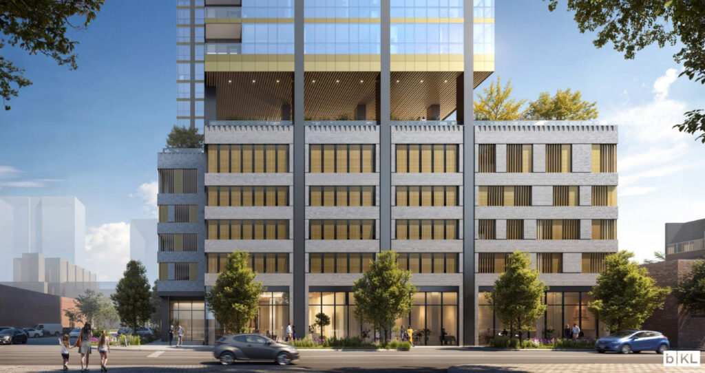 Residential units will begin on the sixth floor, alongside an amenity room and a large outdoor deck. In total, the project will include 340 units, consisting of 105 studios, 190 one-bedroom units, 42 two-bedroom units, and three three-bedroom layouts. Of the total, 68 units will be designated as affordable.