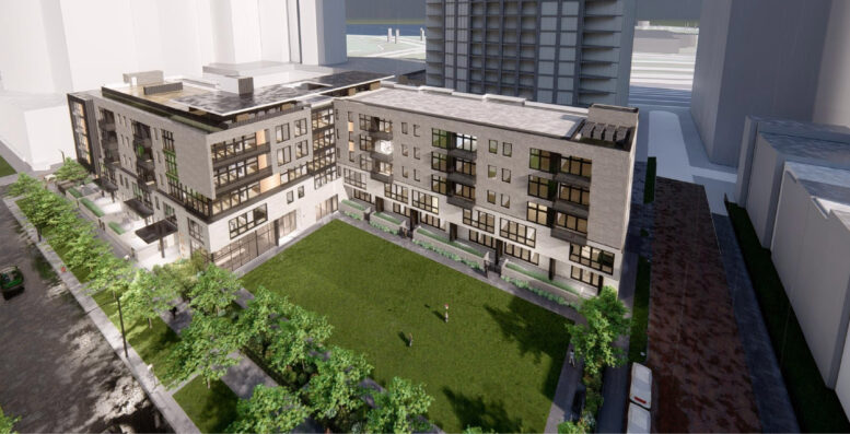 Below the five-story structure will be an 89-space parking garage, accessed via a new ramp off 13th Street. The building above will include a small lobby, bike parking room, fitness room, and 100 residential units, including some duplexes. These will consist of 60 one-bedroom, 13 two-bedroom, 25 three-bedroom, and two four-bedroom layouts.