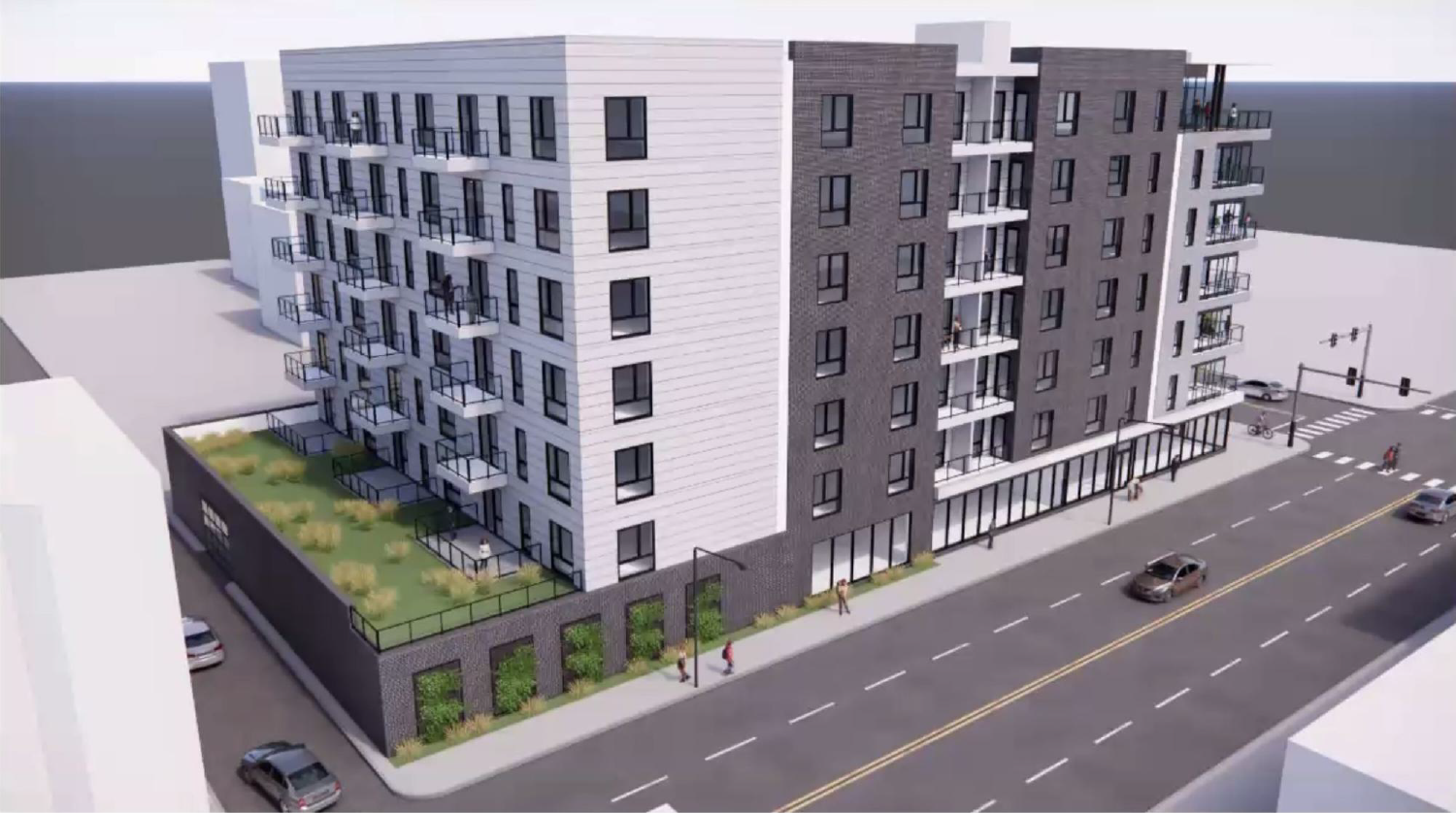 Amenities include a fitness room, co-working space, and a top-floor lounge. Renderings show suspended or inset balconies for most, if not all, units. Rental rates are expected to range from $1,700 to $2,500 per month. No timeline for demolition, the start of construction, and unit completion has been announced.