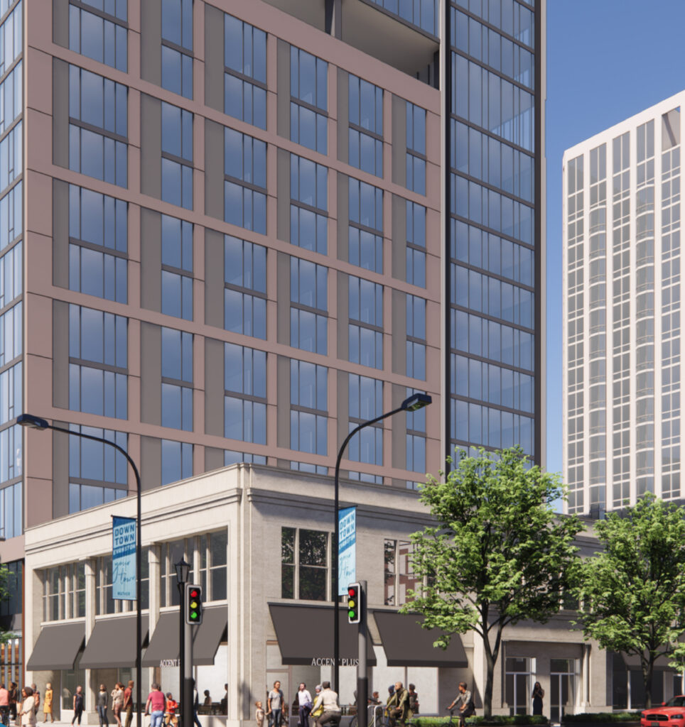 Previously proposed at 31 stories and 330 feet tall, the approved plans reduce the structure to 29 stories and 299 feet. This would still place it above Orrington Plaza’s 277-foot height, as well as the city’s 243-foot height limit. The revisions included removing one of the lower-level podium floors, cutting on-site parking in half to 40 spaces while retaining ground-floor retail.