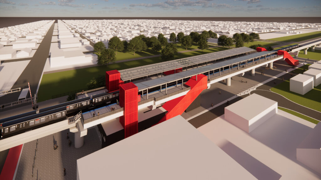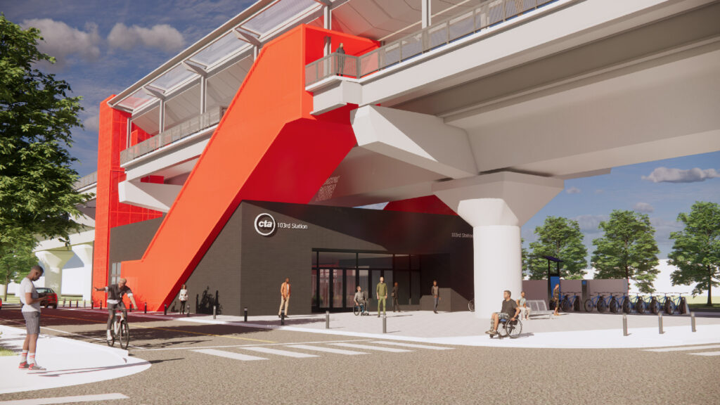 Plans call for four new stations at 103rd Street, 111th Street, Michigan Avenue/116th Street, and the new terminus at 130th Street. Trains will run on elevated tracks through 119th Street before transitioning to at-grade tracks for the remainder of the route. The stations will follow design themes similar to the newly opened stations on the North Side, featuring simple structures with red accents.