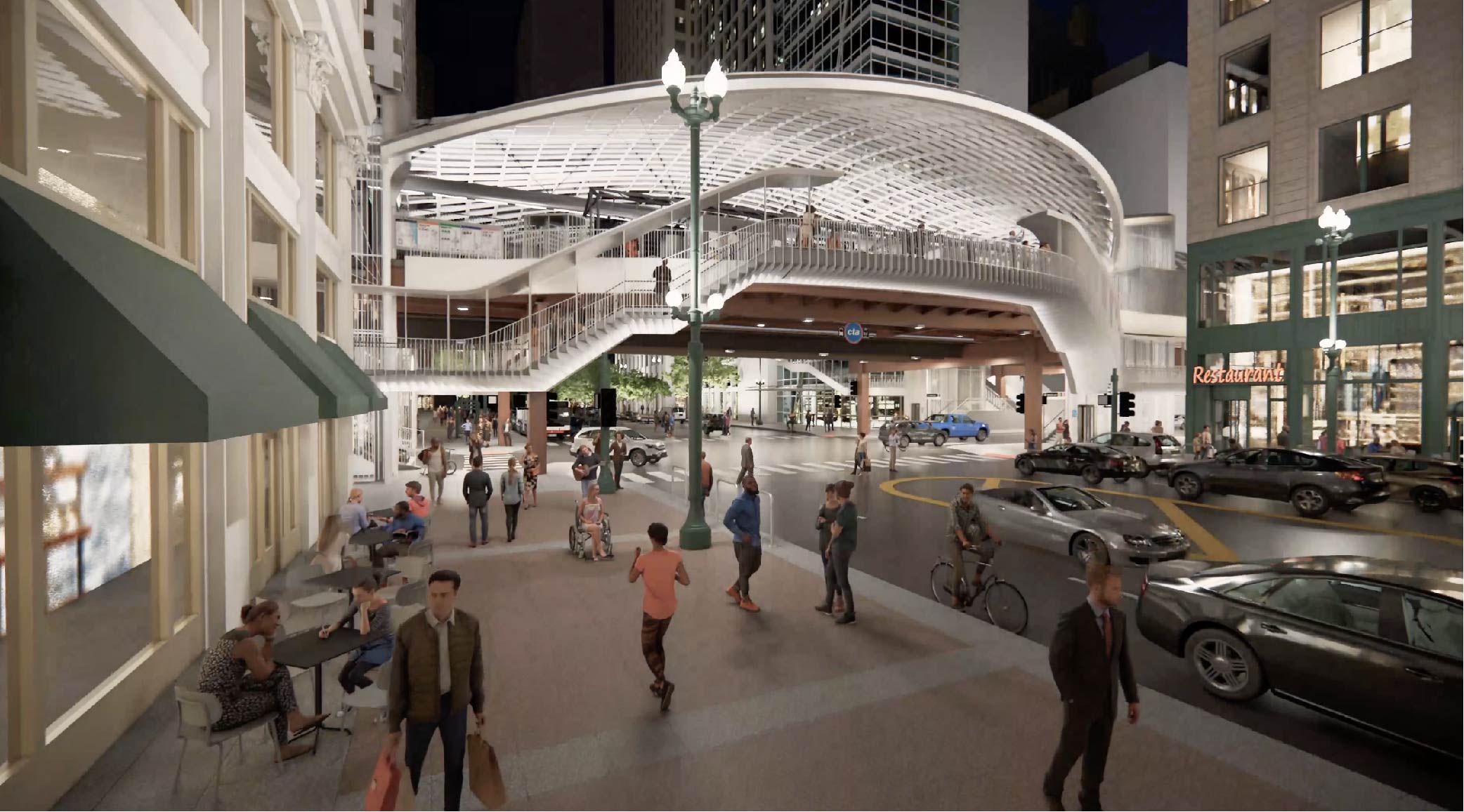 The CTA got 13 decades of use out of the 1895-built Loop station, and it’s time for an upgrade. SOM has designed a glass-topped modern platform with wider walkways, improved lighting, and other features. Expected to last into 2029, work will include ADA-accessible elevators on all four corners of the State and Lake intersection up to the elevated platform, where Orange, Purple, Green, Pink, and Brown Line trains all make stops. Two escalators on the southeast and northeast corners will add increased accessibility.
