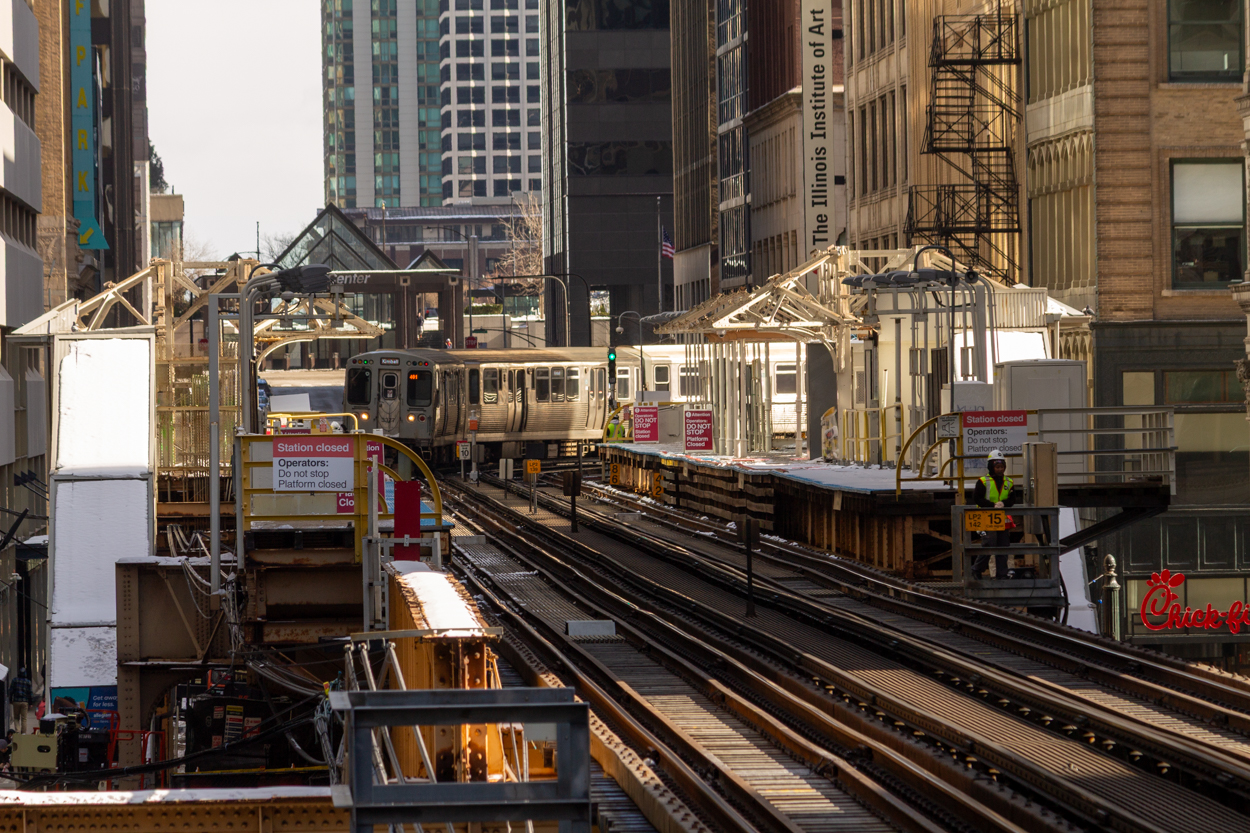 A Brown Line train approaches the skeletal remains of the State/Lake platform, February 2026. Photo by Daniel Schell