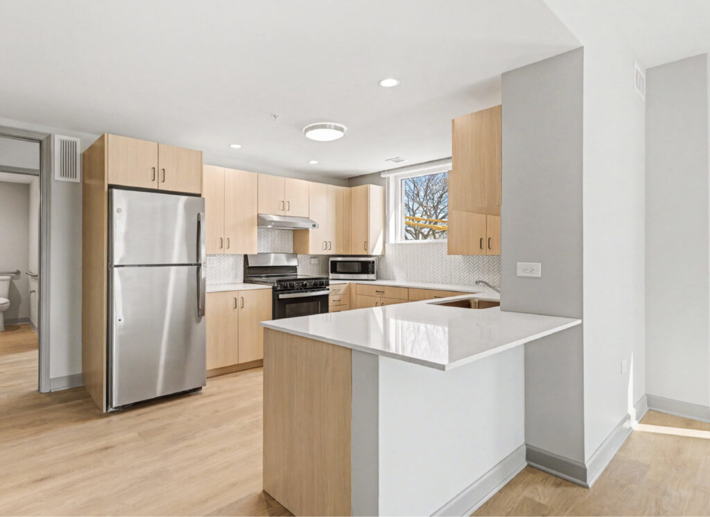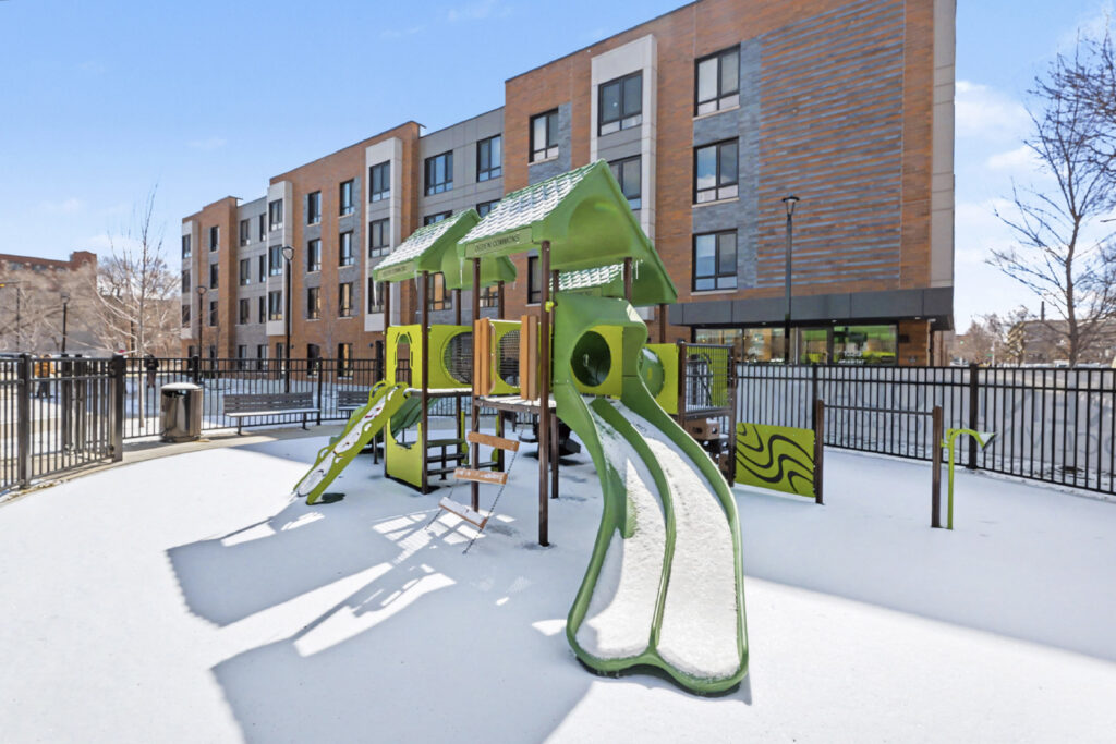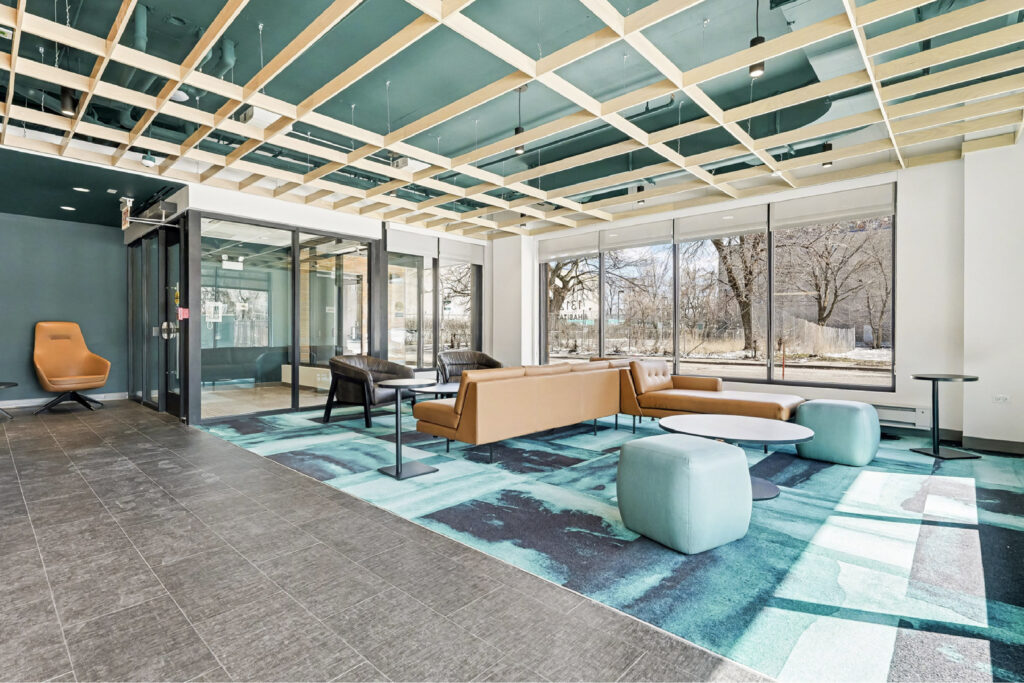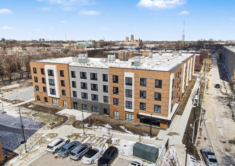 Residents have access to a fitness center, lounge space, and shared laundry rooms within the multi-toned brick and metal panel-clad structure. The $38 million development had been in the works for several years and was fully approved and funded just over a year ago through a mix of TIF funding, loans, and Low-Income Housing Tax Credits.