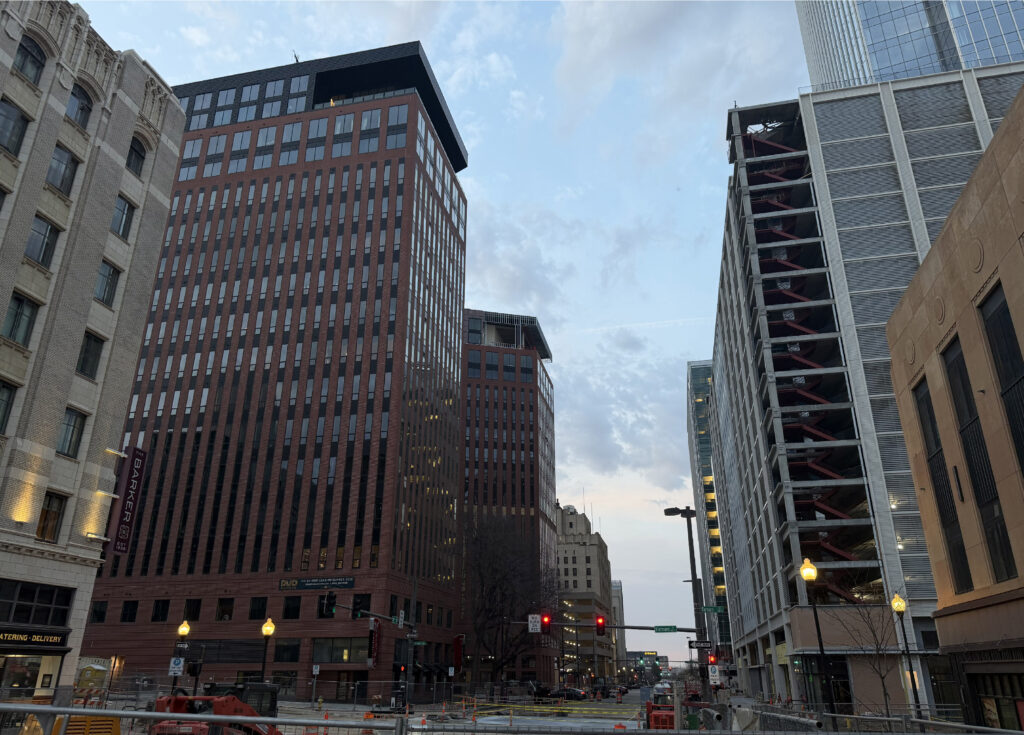 Directly behind the new tower are two existing wedge-shaped office buildings. The 17-story structures are currently being converted to residential use, with a new 12-story rear addition. This project will include new penthouse spaces, six floors of parking, and over 700 units, half of which will be considered affordable. The developer has also credited the streetcar as a catalyst.